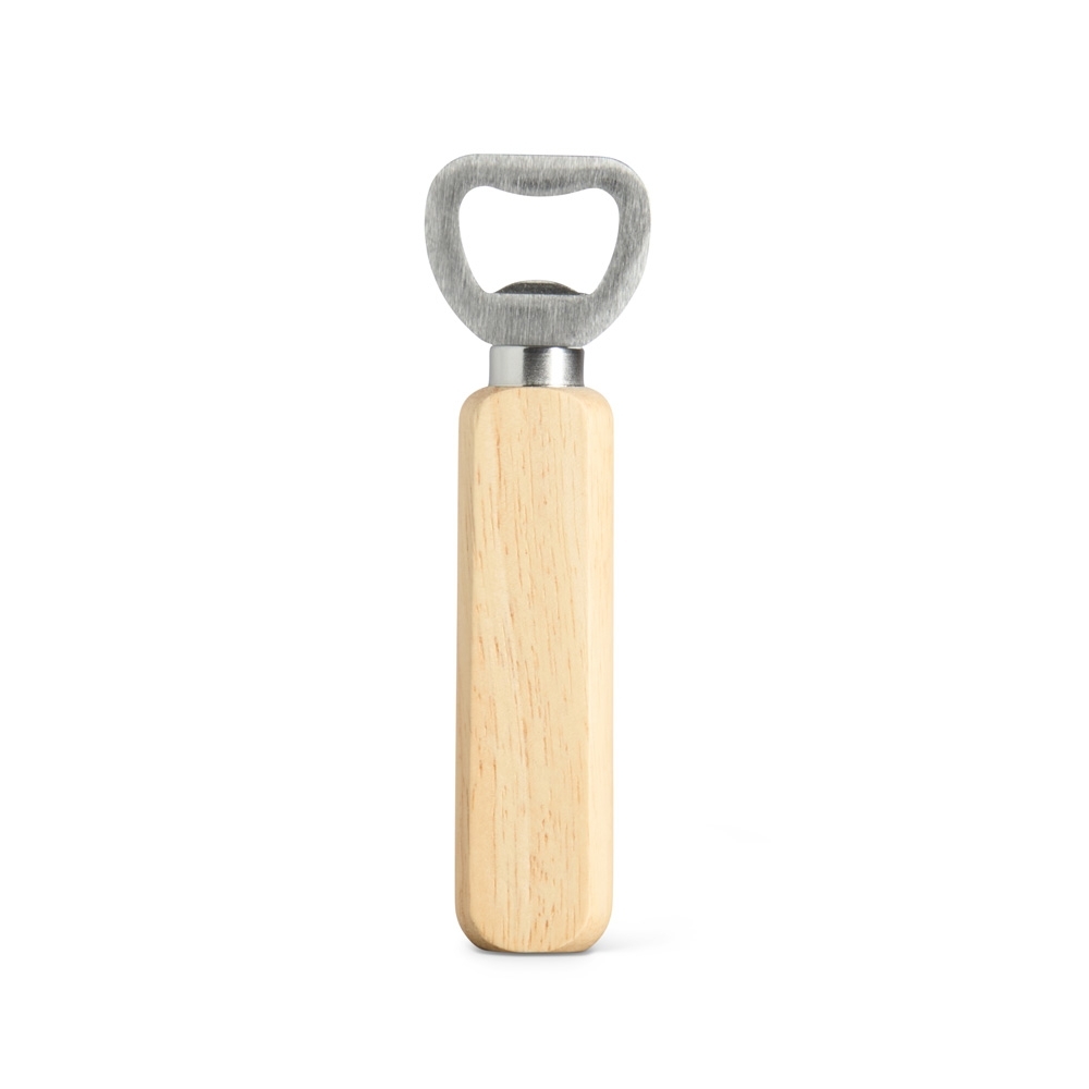 Abridor metálico com cabo de madeira.