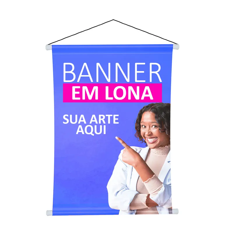 Banner em lona 290g com impressão digital 4×0 com bastão e cordão