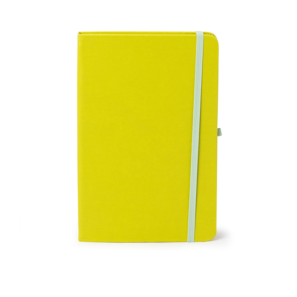Ir para o conteúdoCaderneta em couro sintético com porta caneta, marcador de página em cetim e fita elástica para lacre. Contém aproximadamente 80 folhas pardas com pauta.