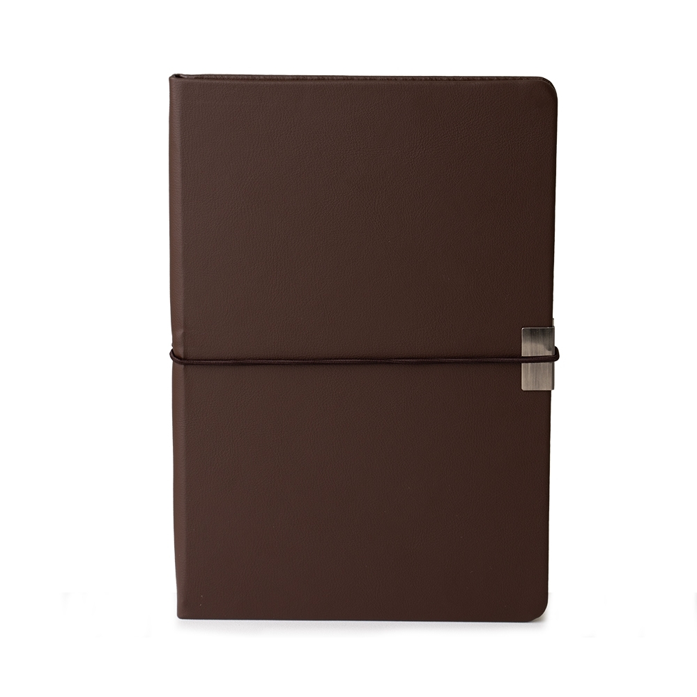 Ir para o conteúdoCaderneta em couro sintético com detalhe metálico, marcador de página em cetim e fita elástica para fechar. Contém aproximadamente 96 folhas marfim com pauta.
