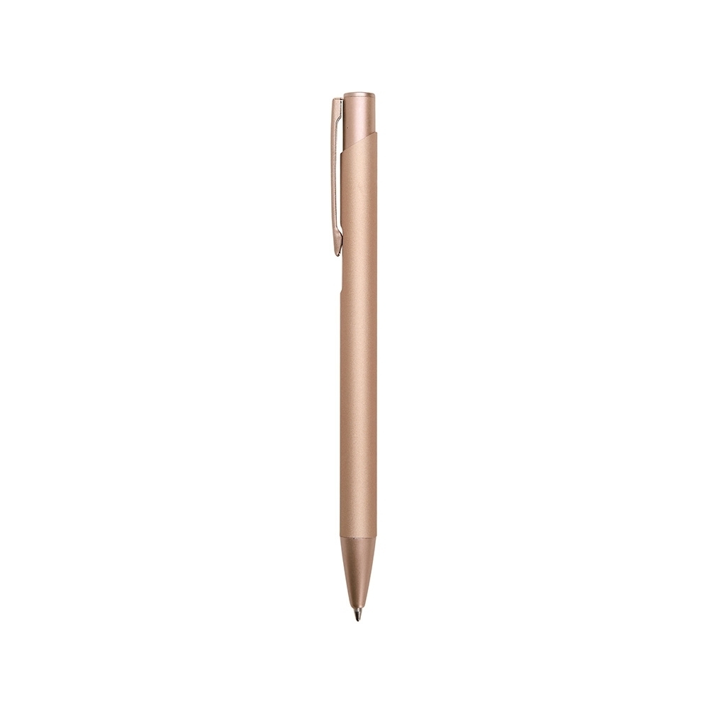 Caneta metálica com ponta e clip em plástico. Possui acionamento por clique e carga esferográfica azul de 1.0mm.