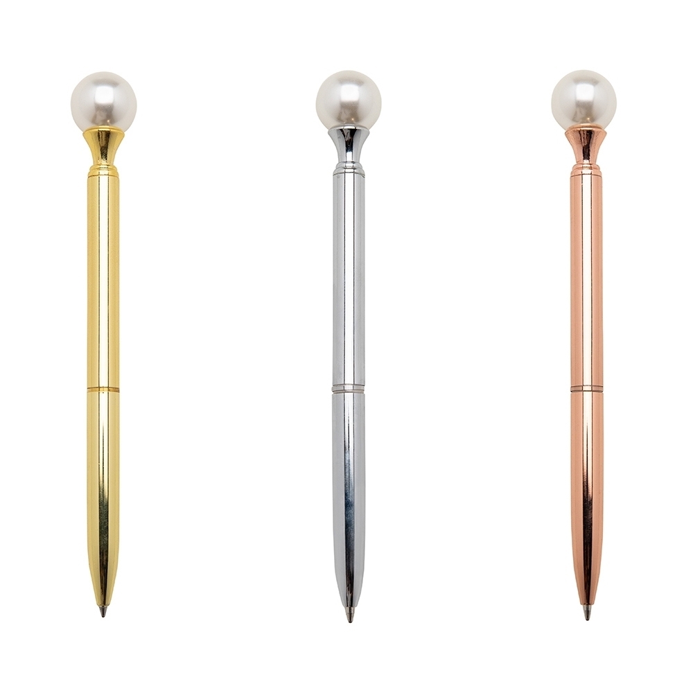 Caneta metálica com detalhe de pérola, carga esferográfica azul e acionamento por rotação. Obs.: Cores mistas, não é possível selecionar cores.