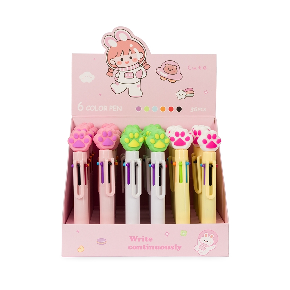 Ir para o conteúdoCaneta esferográfica mista com seis cargas coloridas de 1.0mm e acionamento por clique. Sua construção em plástico e enfeite no formato de patas garantem uma escrita suave e precisa com um toque de estilo único.