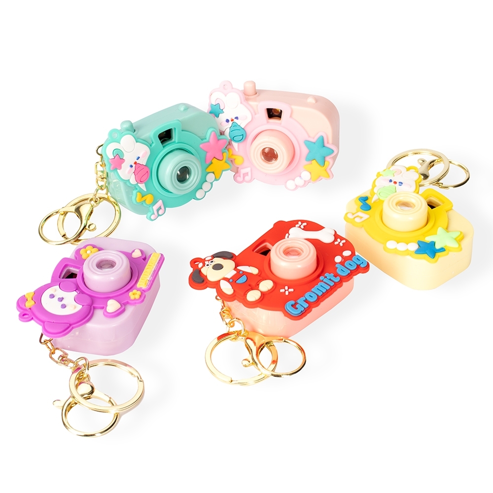 Ir para o conteúdoChaveiro em plástico no formato de câmera, com detalhes decorativos de animais. Possui projeção de oito figuras de animais, acionada por botão, além de argola e mosquetão em metal. Acompanha três baterias L736 já embutidas.