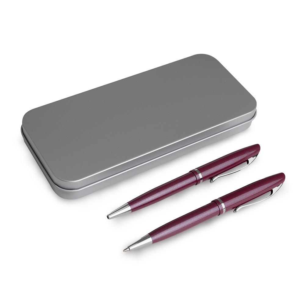 Ir para o conteúdoConjunto de caneta e lapiseira metálicas em estojo metal. Caneta e lapiseira possuem acabamento brilhante, carga esferográfica azul de 1.0mm e acionamento por rotação.