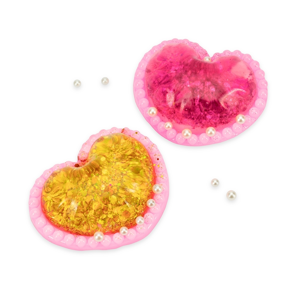 Brinquedo apertável antiestresse em formato de coração. Produzido em borracha termoplástica com superfície lisa e macia, adere facilmente a superfícies planas e acompanha pérolas plásticas para decoração.
