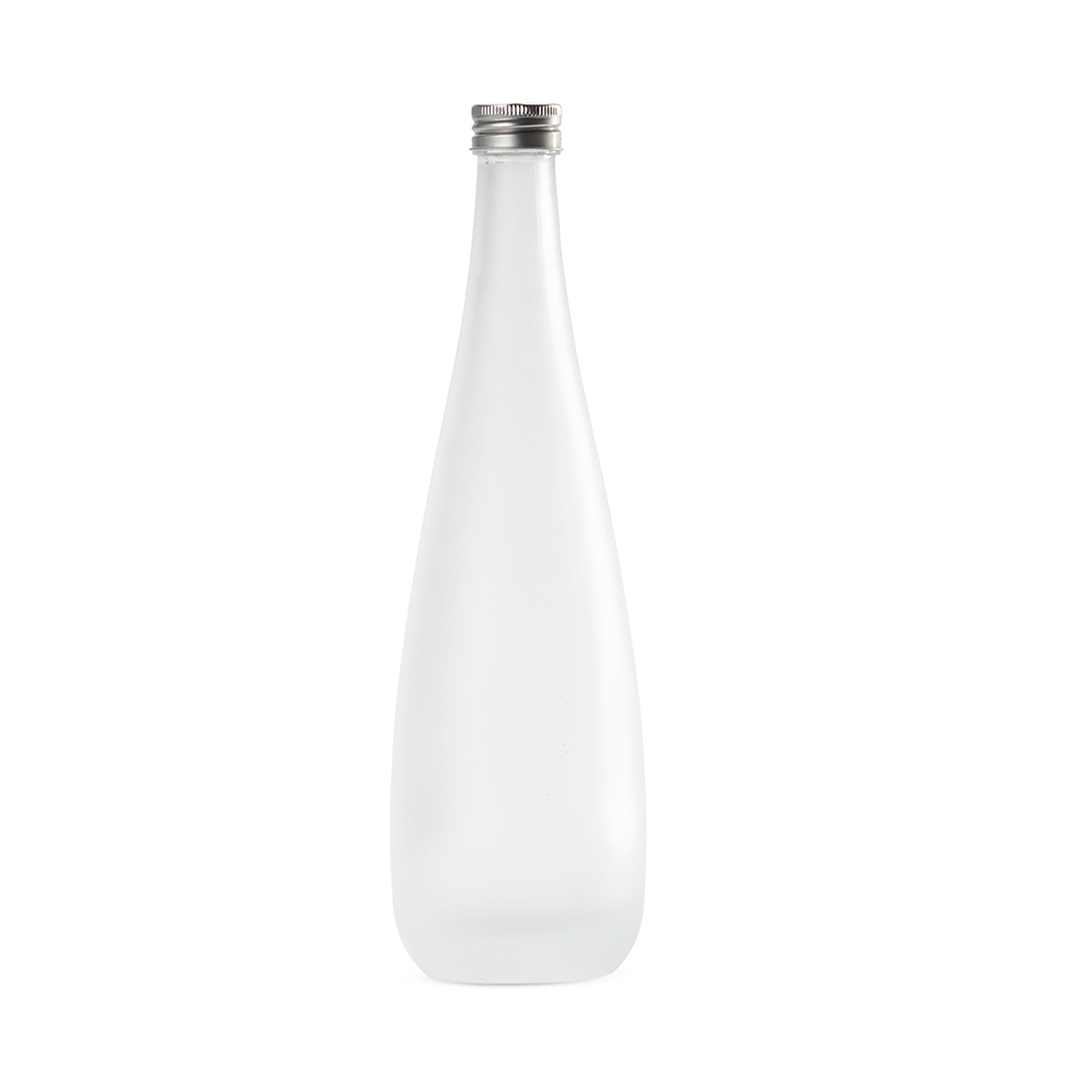 Garrafa de vidro com acabamento fosco, tampa rosqueável em alumínio e capacidade máxima de 550ml.