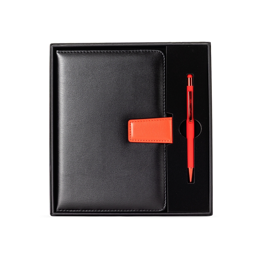 Kit executivo com duas peças, composto por uma caderneta de capa em couro sintético com fechamento magnético e cerca de 20 folhas pautadas, e uma caneta em metal com detalhes em plástico, ponteira emborrachada para uso em dispositivos touchscreen e carga esferográfica azul de 1,0 mm. Acompanha uma caixa de papelão com berço em espuma para a caneta.