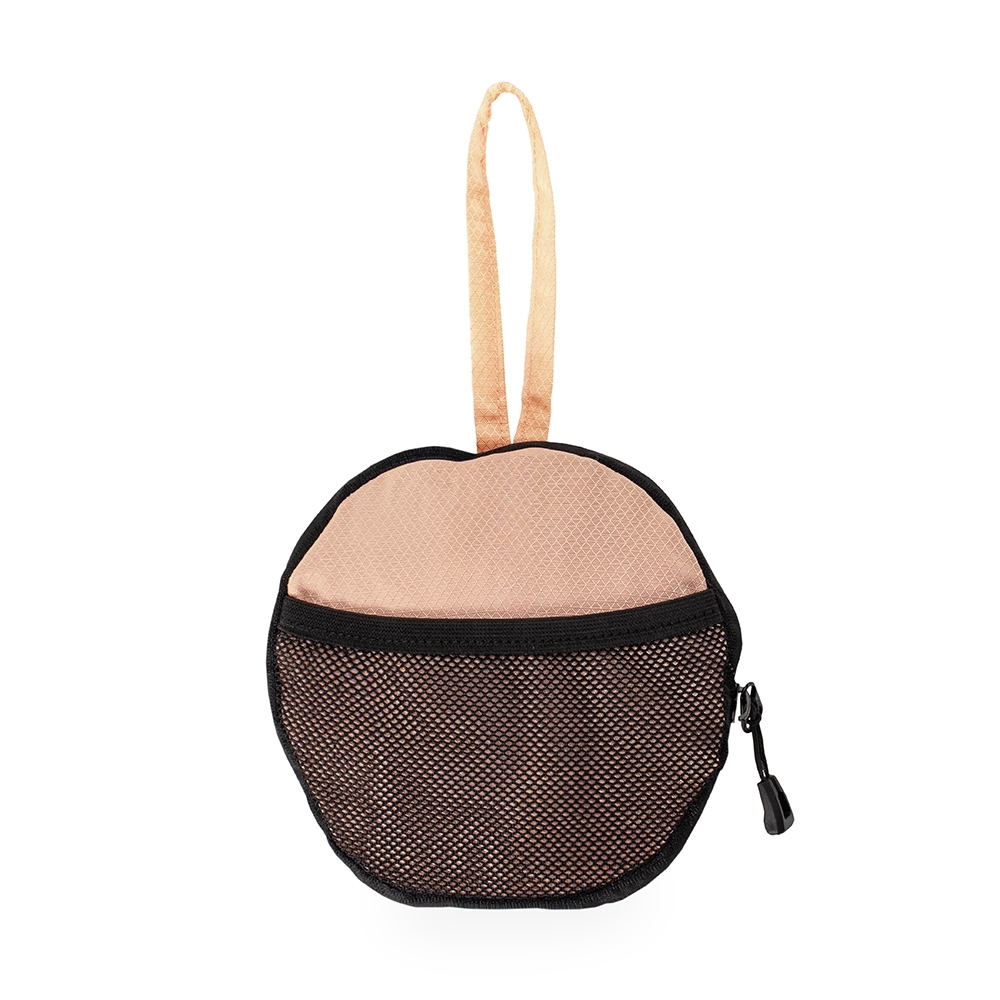 Bolsa esportiva em poliéster 420D resistente à água, com fechamento em zíper e capacidade de 6 litros. Quando dobrada, mantém formato arredondado com bolso telado e uma alça de mão para transporte. Aberta, possui dois bolsos externos: um frontal aberto e outro lateral em tela de nylon com elástico. Conta ainda com duas alças laterais fixas e uma alça transversal ajustável.