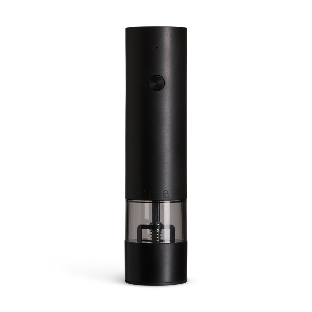 Moedor de temperos elétrico fabricado em plástico e aço inoxidável. Possui mecanismo de moagem acionado por um único botão e entrada USB-C para recarga do aparelho. Acompanha cabo USB-C.