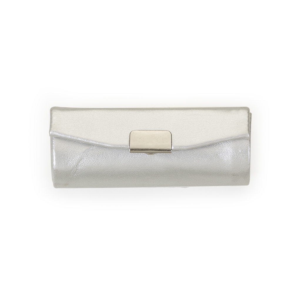 Ir para o conteúdoPorta batom em couro sintético prata com plaquinha de metal frontal com botão para abrir/fechar, possui um espelho interno.