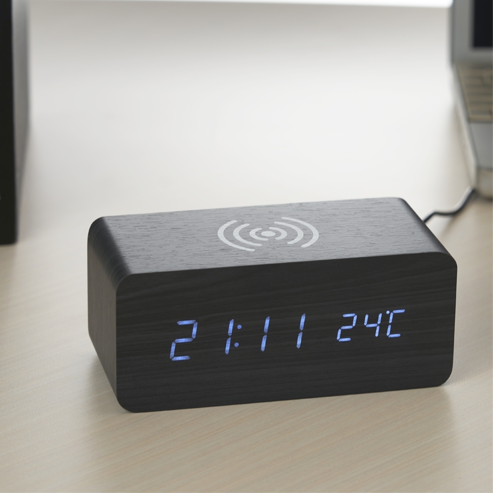 Estilo e praticidade na hora certa! O nosso Relógio digital LED possui alarme, medidor de temperatura e carregamento por indução, carregando smartphones e outros dispositivos compatíveis de forma rápida e fácil, sem a necessidade de fios. Totalmente produzido em MDF, com um display em LED, parte traseira com mecanismo para ajustes, entrada DC 5V e compartimento de pilhas. Podendo ser utilizado através da fonte USB (acompanha) ou 3 pilhas AAA (não acompanha).